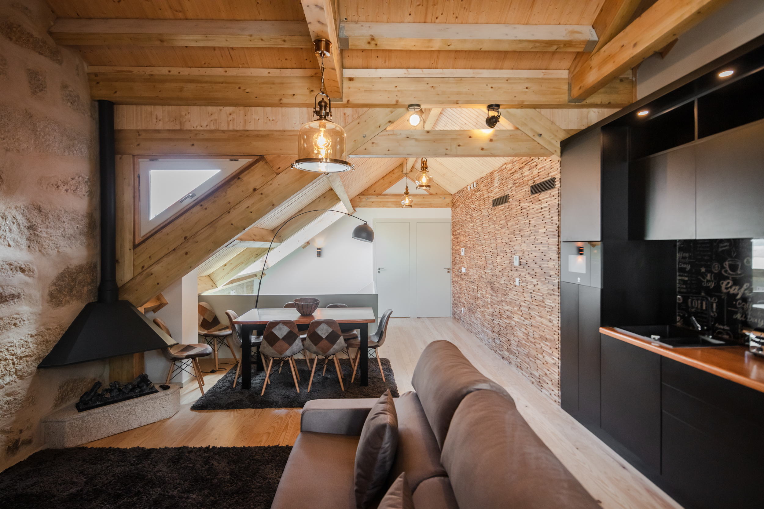 It is a Rustic Portuguese Rooftop house optimized for 6 people, but suitable for 8 due to the sofa bed.