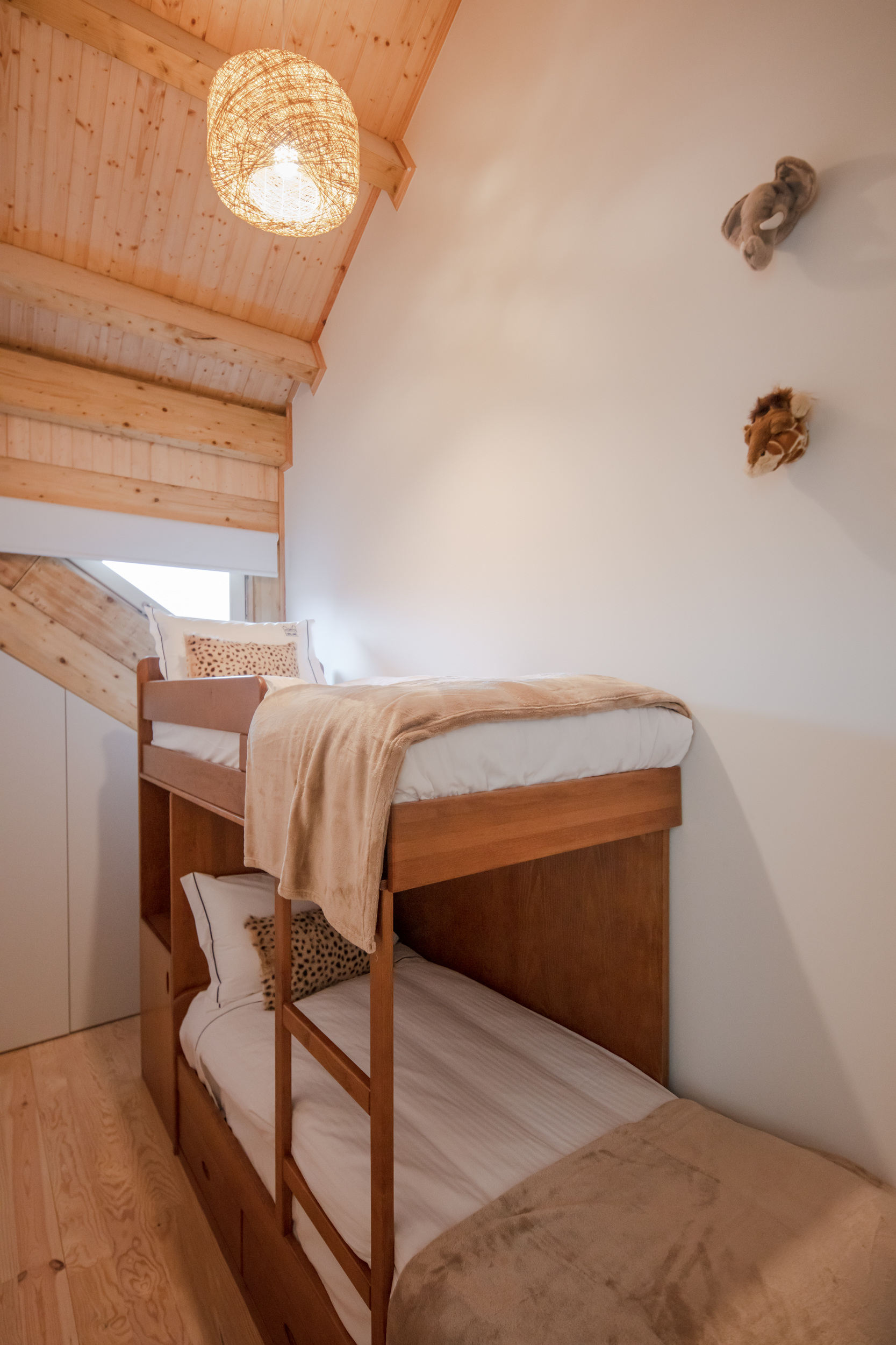 It has two suites (Bedroom+full WC), one bedroom designed for two children with a bunk bed and one sofa bed for two. It’s very spacious and the kitchen is fully equipped with toaster, coffee and tea machine, fridge, oven, microwave,…